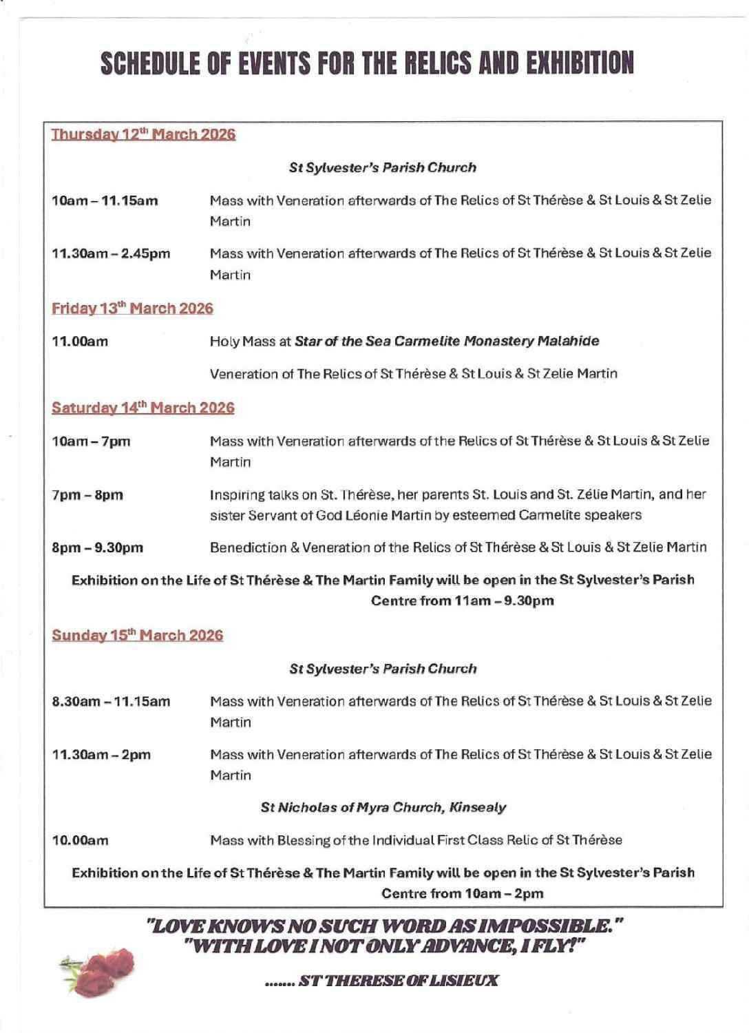 Our Exhibition on the Life of St. Thérèse and the Martin Family will be in St. Sylvester's Parish Centre on Saturday 14th March 11am - 9.30 pm and Sunday 15th March 10am - 2pm.
