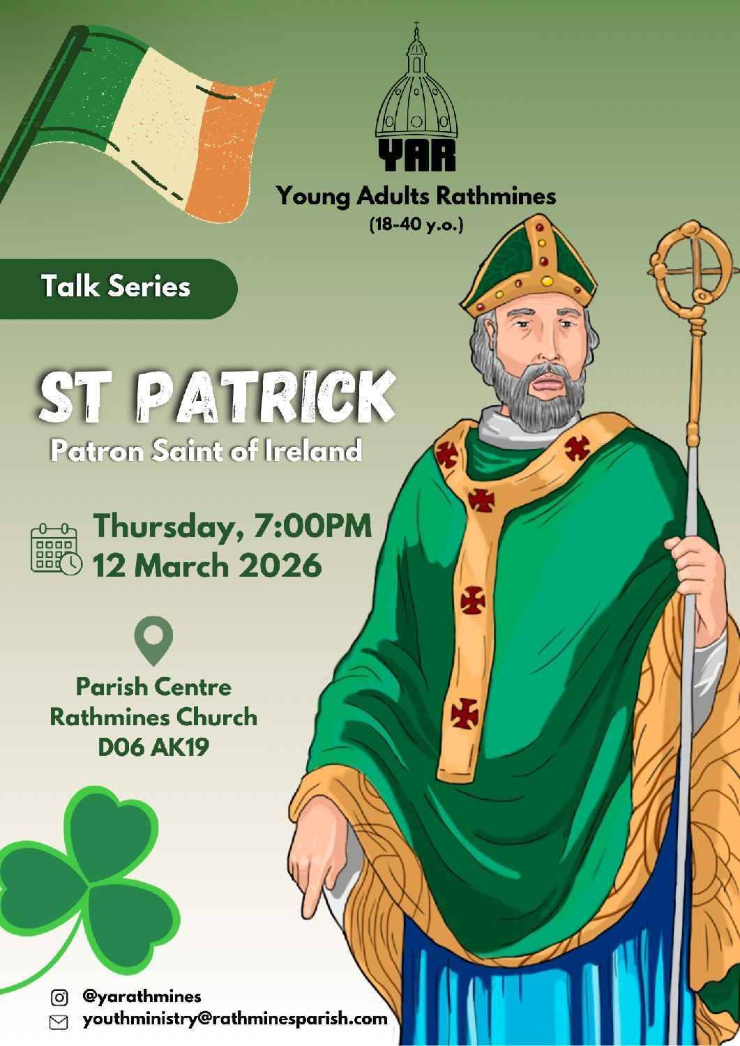 Join us for a relaxed evening as we explore the life and story of St Patrick, his mission in Ireland, and why his legacy still matters today. Expect an engaging talk, good conversation, and a chance to gather with other young adults from all over Dublin.